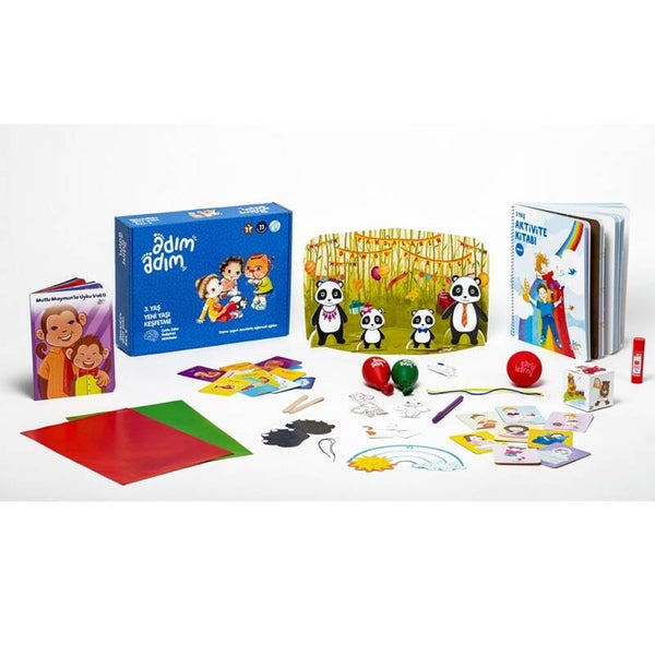 Set içerisinde bir aktivite kitabı , Mutlu Maymun kitabı, 3 Boyutlu Pandaların Bambu Partisi, Sesler Neye Ait aktivite kartları, Birlikte Oynayalım aktivite kartları, Bir İki Panda Hop aktivite malzemeleri, Ayı Ton Ton Ne Yapıyor küpü, Gökkuşağı Yapıyorum Kartonu, Gölgeler aktivitesi malzemeleri, Kuyrukları Bul aktivitesi kartları, Attım Tuttum aktivitesi malzemeleri bulunur. Bu aktivitelerden 3 Boyutlu Pandaların Bambu Partisi aktivitesi ile hayal gücünü geliştirir. Sesler Neye Ait aktivitesi ile ilişki kurmayı , Bir-İki Panda Hop aktivitesi ile komutlara uymayı öğrenir.