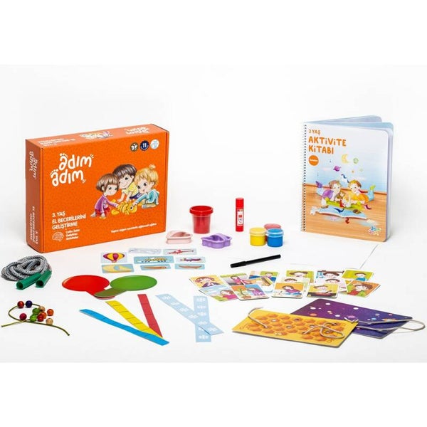 Set içerisinde bir aktivite kitabı , Yılanın üstünden atlıyorum aktivite malzemeleri, Kar yağıyor aktivitesi kartları, İpe boncuk geçirme aktivite malzemeleri, Ellerimle neler yaparım aktivitesi kartları, Benim güzel elim aktivite malzemleri, Parmak izlerim aktivite malzemeleri, Delikten ip geçiriyorum aktivitesi kartları ve malzemeleri, Güneş, uçurtma, denizanası yapıyorum aktivitesi kartları, Hamurdan şekiller aktivite malzemeleri, Dur-geç, İleriye-geriye aktivitesi kartları, Hangisi havada hangisi denizde aktivitesi kartları bulunur. Bu aktivitelerden Parmak izlerim aktivitesi ile hayal gücü gelişir. Dur-geç, İleriye-geriye aktivitesi ile trafik ışıklarını öğrenirken komutlara uymayıda öğrenir.
