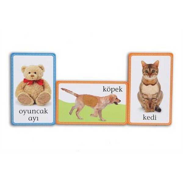 16 karttan oluşan İlk Sözcüklerim’de çocuğunuzun günlük hayatta karşısına çıkan nesnelerin renkli resimleri, her nesneye ait farklı dokulu alanlar, İngilizce ve Almanca karşılıkları bulunuyor. Bunların dışında kartların arka tarafında nesnelerle ilgili çocuğunuza sorabileceğiniz basit sorular yer almaktadır.