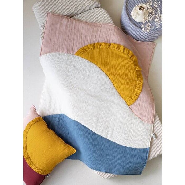 Deze knusse deken is gemaakt van mousseline en heeft een prachtige textuur, heerlijk zacht, lichtgewicht en toch duurzaam. Het heeft een charmante zonsopgangprint die de baby een zachte visuele stimulatie geeft.
