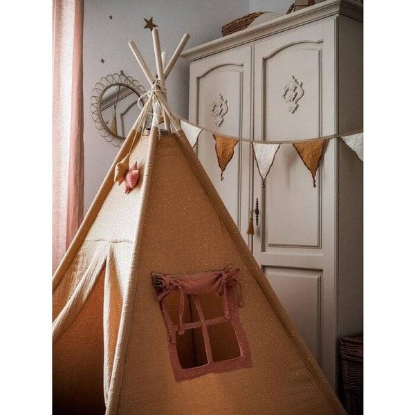 Tipi is een geweldige ruimte om zowel thuis als in de tuin te spelen. Een tipi kan ook een plek zijn om door boeken te bladeren of je schatten te bewaren.