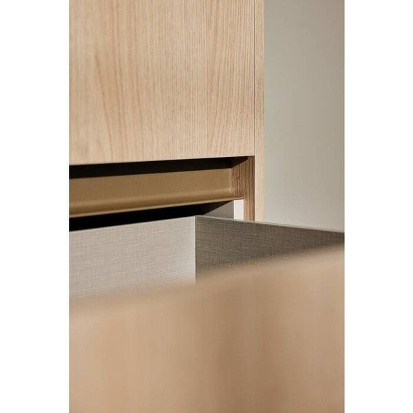 De commode en lades zijn gemaakt van gemelamineerd plaatmateriaal in combinatie met metalen onderdelen. Het gebruikte MDF en spaanplaat bestaan voor een groot deel uit gerecycled materiaal uit Duitsland en België. Alle onderdelen zijn goed te onderhouden en volledig te recyclen. We vervaardigen alle meubels in Nederland.