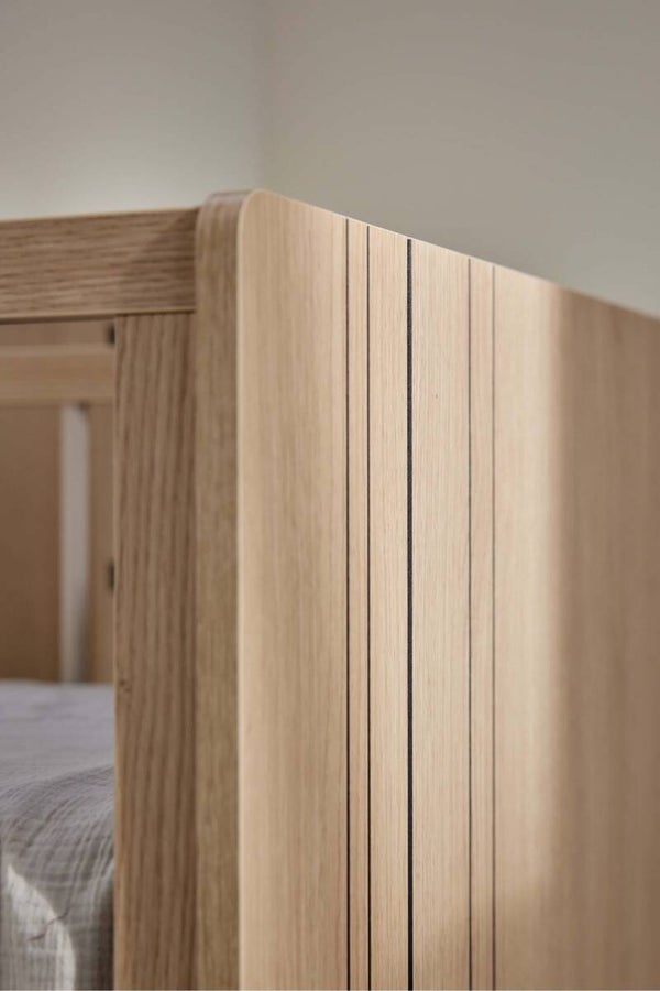 Voor de stijlvolle babykamer, ons ledikant hout is geïnspireerd op de Wabisabi en Japandi stijl dat past in elk interieur. De ovaalvormige spijlen in combinatie met de typische zwarte Frendly lijnen geven het houten ledikant een vriendelijk en stoer karakter. De bedbodem is eenvoudig te fixeren in een hoge of lage stand.